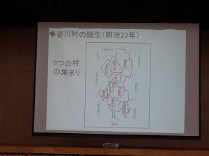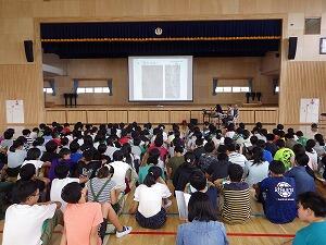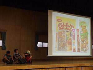 講師の方のお話に耳を傾け,スライドを参考にしながら自分たちの住む地区にある史跡について学びました。
