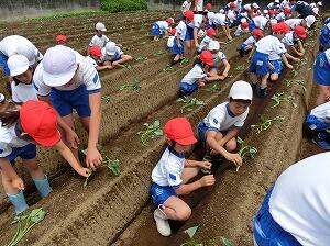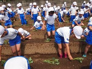 秋に大きなサツマイモになることを祈って,みんなで協力して苗植えを行っていました。