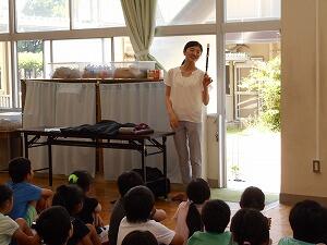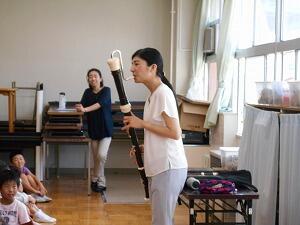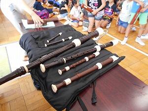 リコーダーの基本的な演奏の仕方などを教えてくださいました。また,大小さまざまなリコーダーの演奏に興味津々の子どもたちでした。