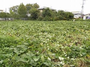 ツルが伸び,ジャングルのようになった畑で,雑草を抜きました。