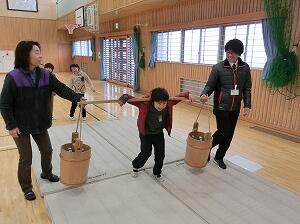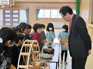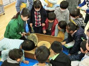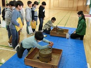 県立博物館の職員の方が来校し,3年生に向けて社会科の学習につながる昔の道具を紹介していただきました。初めて見る物の使い方を聞いたり,石臼や天秤棒を実際に体験したりして,昔の人の暮らしを感じることができました。。