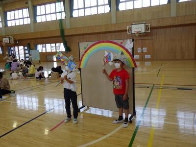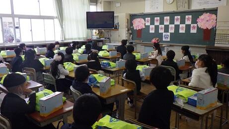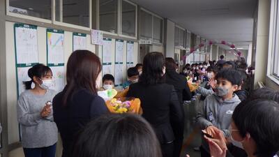 4月14日,昨年度までお世話になっていた12名の先生方をお招きし,離任式が行われました。転退出された先生方へ,代表児童が花束をプレゼントしたり,別れの言葉を伝えたりしました。教室からリモートで式に参加した子どもたちは,先生方の姿がテレビに映ると,手を振ったりあいさつしたり久しぶりの再会を喜んでいました。中には,先生方お一人お一人からの言葉を聞いて涙がこぼれた子どももいたようです。