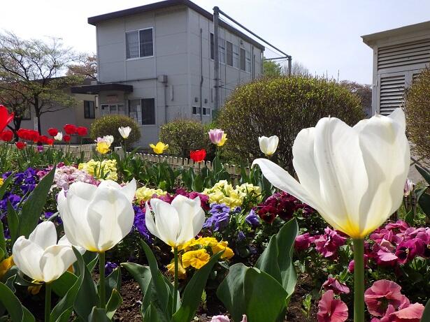 栽培委員会の児童や,担当の先生方のお世話のおかげで,チューリップやルピナス,ビオラなど,たくさんの花々が見ごろをむかえています。
