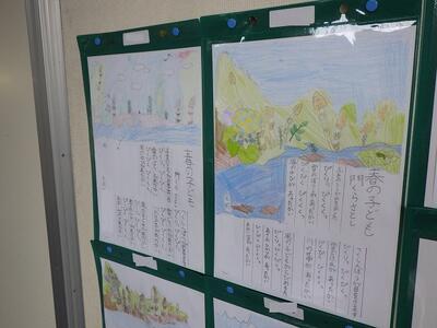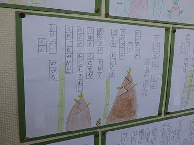 校庭だけでなく,こんなところにも春が。2年生は「たけのこぐん」を,3年生は「春の子ども」をそれぞれ視写しました。個性豊かな春の植物が学校内を華やかに彩っています。