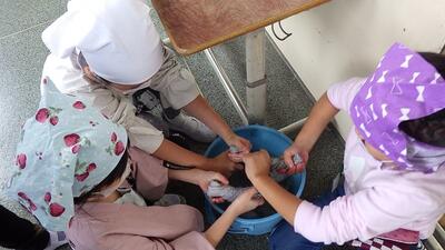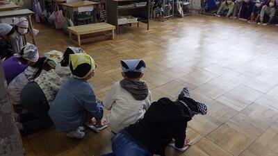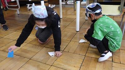 ↓ 1年生は,ダスキンの方から教えていただいた雑巾のしぼり方を実践!素晴らしいです!