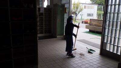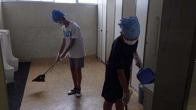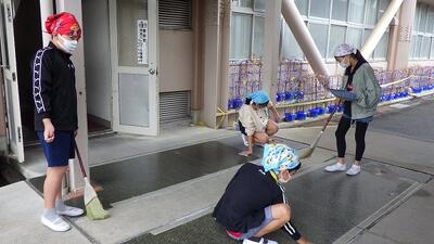 本校では,月曜日,火曜日,木曜日に清掃を行っています。現在は,感染症予防の観点より,縦割り班ごとの清掃ではなく,学年ごとに割り当てられた分担場所を清掃しています。