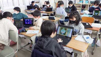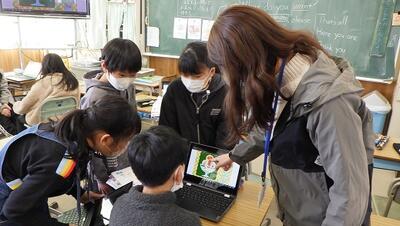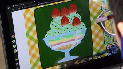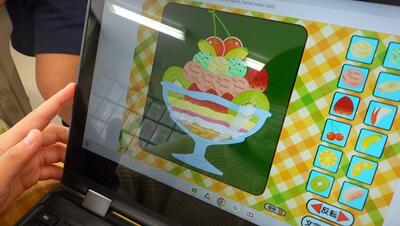 外国語活動の時間に,一人一台端末を使ってパフェづくりをしました。お店屋さんとお客さんに分かれ,お店屋さんはお客さんの注文をよく聞いてフルーツやアイスクリームをパフェの器に盛りつけていきます。