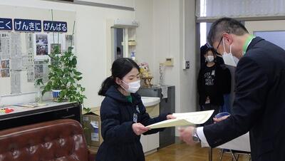 次に,在校生を代表して5年生児童から挨拶がありました。学校のために働いたり,下学年を手助けしたりしてくれたことへの感謝の気持ちとともに,中学校でも活躍してほしいという応援のメッセージを伝えました。