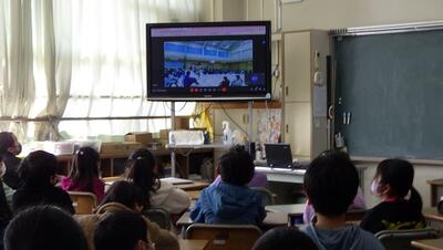 まずはじめに学級ごとに撮影した6年生へのメッセージ動画を見ました。縦割り班活動や,学校行事等でお世話になった6年生へ感謝の気持ちを込めて作成しました。