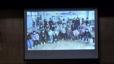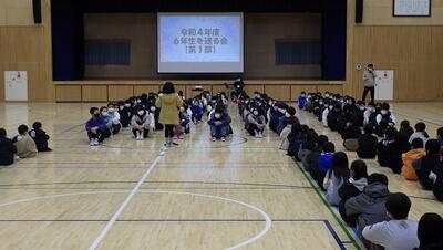 第1部では,5,6年生は体育館に集まり,1~4年生は教室と体育館をMeetでつなぎオンラインでの参加となりました。