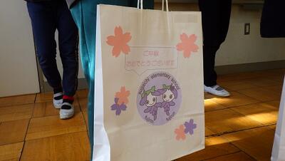 5年生の児童が会を進行し,1~5年生が作ったプレゼントを渡しました。1年生は感謝のメダル,2年生しおり,3年生ジグソーパズル,4年生メッセージカード,5年生メッセージ付きの下敷きを作りました。袋は,5年生が心を込めてデコレーションしました。