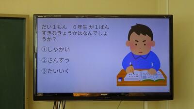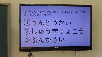 次に5年生が6年生へアンケートして作成した「6年生クイズ」をしました。姿一小の6年生が好きなものや,苦手な物など楽しそうに予想していました。