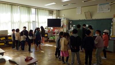 ロング昼休みの時間を使い,6年生を送る会第2部が行われました。第2部は,各教室に縦割り班ごとに集まり,5年生が中心となって活動しました。1年生を教室までお迎えに行く仕事も初めて5年生が担当しました。