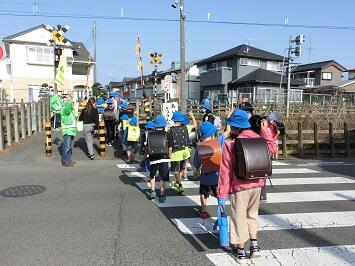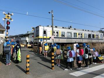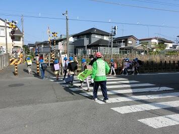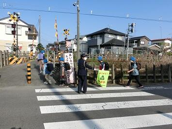 今回は通学路のうち東武宇都宮線踏切付近の登校の様子を見ました。交通指導員や見守りボランティア,保護者の方々の指導を受けながら歩いていました。児童が安全に通学できるのは,こうした方々のお陰です。感謝申し上げます。