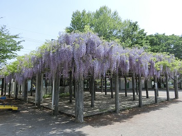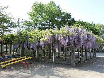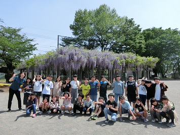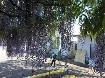 本校、そして本市の宝物である大藤が見ごろを迎えています。19日に確認したときよりも、さらに多くの花が咲き、房の長さも40㎝を超えるほど長くなっています。子供たちからは「お花のカーテンみたい!」といった声も聞こえていました。