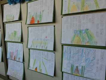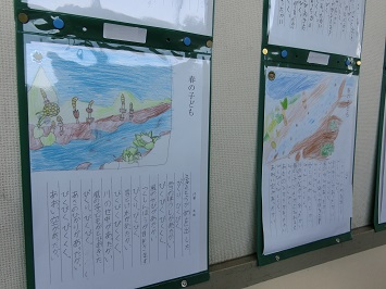 それぞれの学級の壁面に子供たちの作品を掲示しました。国語の教科書に掲載されている詩を視写したものや図画工作の時間に描いた作品など、学年によってテーマは様々です。