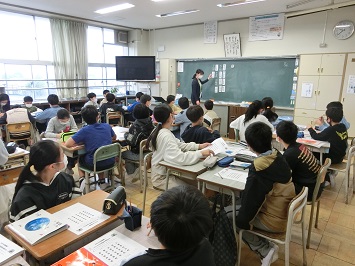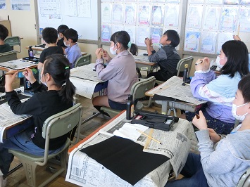 初回の今日は、教員の手本や映像を見ながらクラスみんなで、姿勢や筆の持ち方を確かめることから始めました。