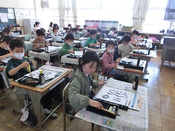 確認が終わると、縦画や横画など簡単なものを書きました。初めて筆を持ったという児童もいたようですが、「もっと書きたい!」という声も聞こえ、既にやる気は十分のようです。次はどんな文字を書くのか楽しみですね。