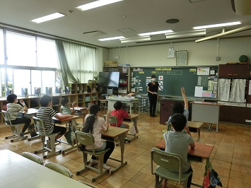 南警察署よりスクールサポーターの高島様をお招きし,不審者が校内に侵入したことを想定した避難訓練を行いました。