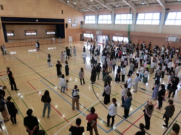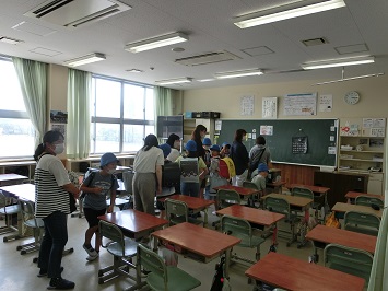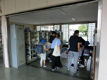 一斉のメール配信にて保護者の方々に体育館にお集りいただいた後,自治会を単位として学校から遠方のご家庭から児童の待つ各教室へお迎えに行っていただきました。