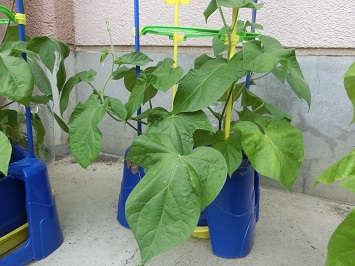 1年生が生活科の学習で育てているアサガオが大きくなっています。葉は,児童の手の平くらいの大きさまで成長し,ツルも長く伸びています。授業中に設置した支柱にツルが巻き付いている様子も見られます。