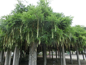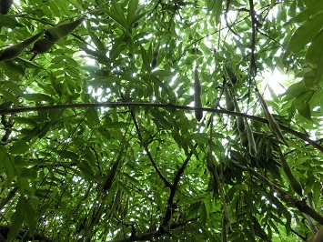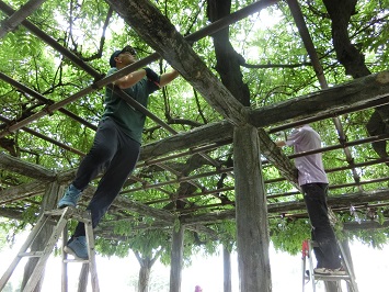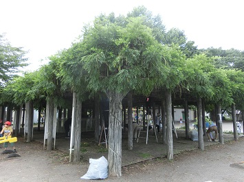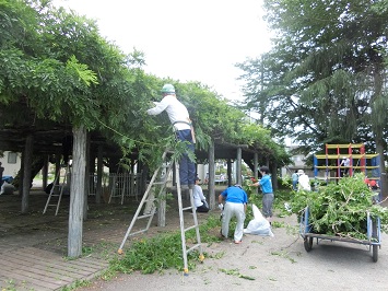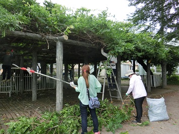 フジ愛護会の皆様が来校し,大藤の豆鞘摘みをしてくださいました。作業前は,左下の写真のようにツルが外に伸び,葉と鞘豆もたくさん茂っていました。