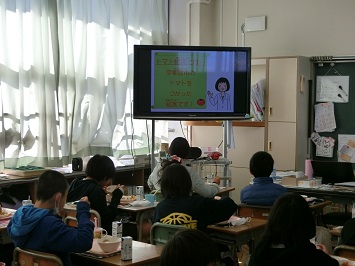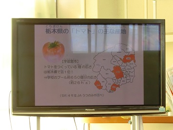 これに先立ち,宇都宮市教育委員会学校健康課学校食育グループが作成した「トマト給食のはじまり」についての動画を各教室にて視聴しました。宇都宮市のトマトは,作付面積が県内1位であり,1を通して収穫されているそうです。