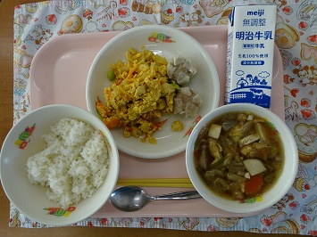 <献立>ご飯,牛乳,おつかれサマー!トマたまどん,ポークしゅうまい,けんちん汁