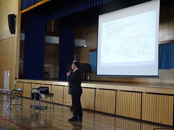 お子様が職員と共に検診を受けている間に,体育館にて保護者説明会を行いました。学校長からは主に学校経営について,1学年主任からは入学までに準備する持ち物について,事務職員からは学校諸経費の納入方法等について説明しました。