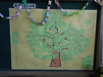 学年の発達の段階に応じて,そして,各学級担任のアイディアと工夫により児童のよさを互いに認め合う場面をつくっています。時には授業中に行うこともありますが,それ以外で伝え合うこともあります。その一例を挙げますと,善い行いや優しいと感じた振る舞いをカードに書いて掲示しています。あるいは,帰りの会で輝いた行いや頑張っていることを発表し合います。