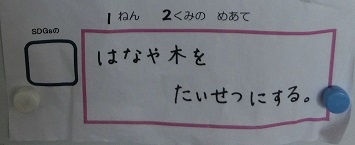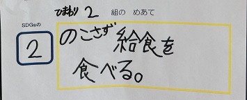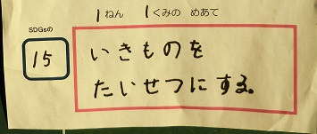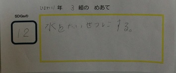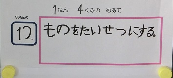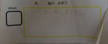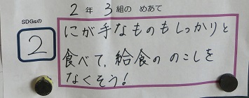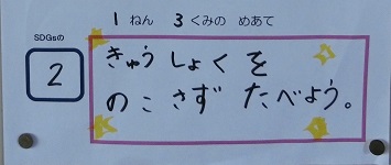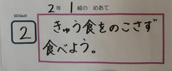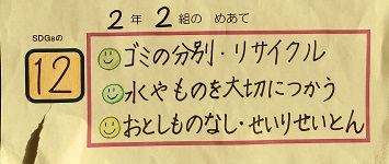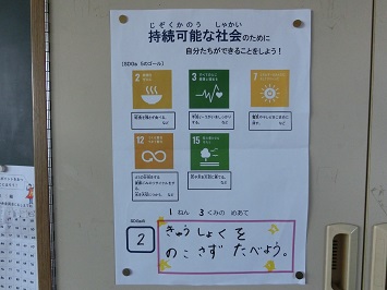 SDGsには,人間がこの地球で暮らし続けることができるように17のゴールが掲げられており,学校生活の中でもできそうなゴールが5つほどあります。本校では,環境委員の5,6年生と担当教諭が中心となって本校の児童にもSDGsに進んで取り組んでもらいたいと,5つのゴールの中からクラスごとに1つ選んで,めあてを立て実践しています。このめあては,各教室内に掲示していつでも確認できるようにしています。