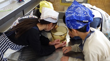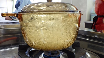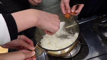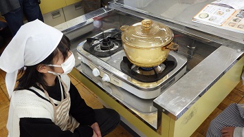 透明な鍋で、米が炊き上がる様子を観察しました。炊飯器を使っている家庭が多いため,興味津々な様子でした。