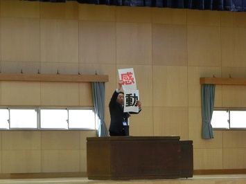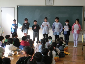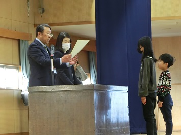 次に,学校長から話がありました。「今年一年を表す漢字」を話題に挙げ,学校長は「感」という字を選んだことを紹介しました。普段の授業において本校児童の様子に「感心」「感動」したこと,また,冬休み中は家族に「感謝」し過ごしてほしいという気持ちから選んだことも伝えました。