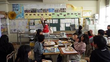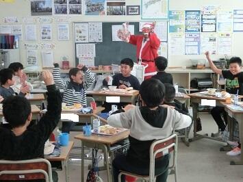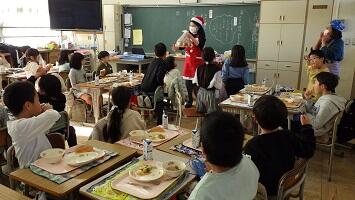 クリスマスの今日は,献立にも季節感を出しました。年内最後となる給食のしめくくりは,クリスマス仕様のデザート付きです。そこで,そのデザートをこの日のために特別編成されたS1Xmas Teamが各学級に出向いて配りました。ちょっとしたプレゼントになればと思います。