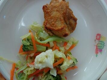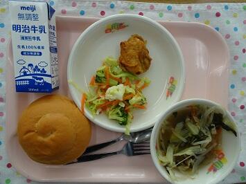 <献立>バターロール,牛乳,タンドリーチキン,ミニサラダ,やさいスープ,クリスマスデザート