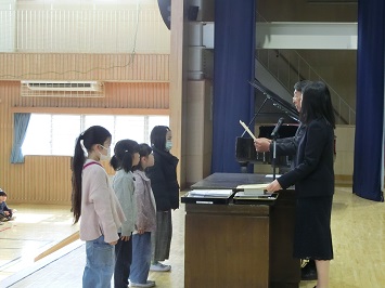 学校長からは,本日渡される通知表には,この1年間で各学級担任が見つけた児童の皆さんが頑張りについて書かれてること,またそこには書ききれないほど児童の皆さんは大きく成長したことを伝えました。また,4月からの新しい学年でも自身の力を伸ばしていってほしいということも伝えました。