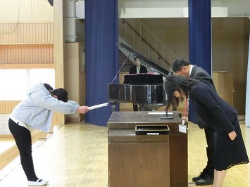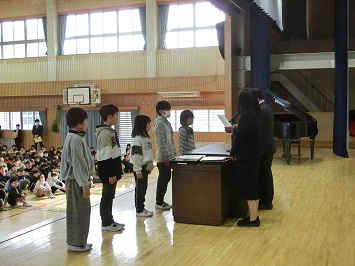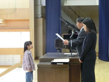 学校長から各学年の代表児童が登壇し,修了証を受け取りました。代表にふさわしい立派な態度でした。