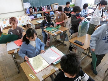 春休み中の過ごし方や新年度の持ち物などを確認したり,これまでの学習で使用したプリントや作品などをファイルに綴じこんだりしました。また,学級担任から通知表を受け取り今年度の頑張りなどを一人一人に話をしました。