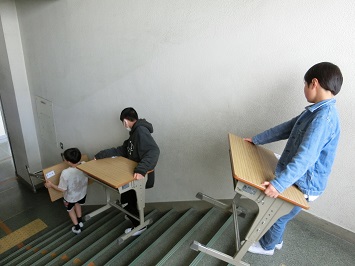 毎年,5年生の児童が,4月からの新しいクラスの人数に合わせて,机と椅子が多い教室から足りない教室に机と椅子を運んでいます。移動先をよく確認したり,人手の足りない教室にすばやく移動したりと一生懸命作業していました。