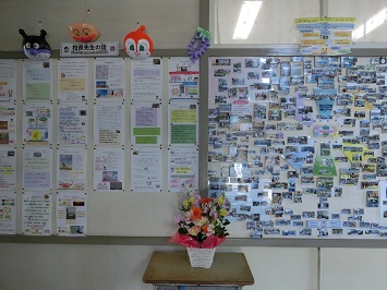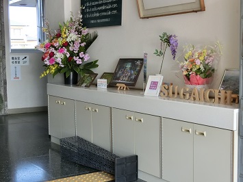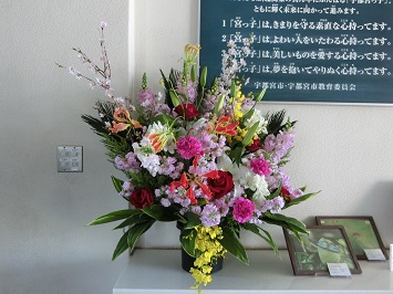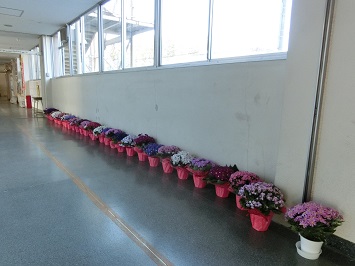 当日式場内に飾っていたお花を正面玄関や校長室前の廊下に移動させました。日直の教職員が世話をし,現在もきれいな花を咲かせています。
