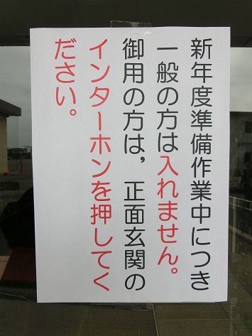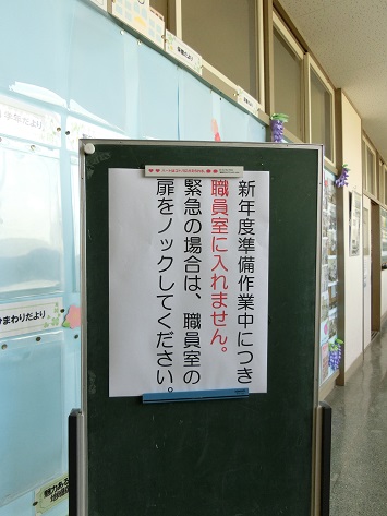 この他にも,教具の片付けや教室の整備など,新年度に向けて準備を進めています。そのため,春休みが終了する4月7日(月)までは,一般の方が校内へ入ることをご遠慮いただいております。ご用の方は,正面玄関にあるインターホンにてお知らせください。どうぞよろしくお願いいたします。
