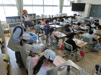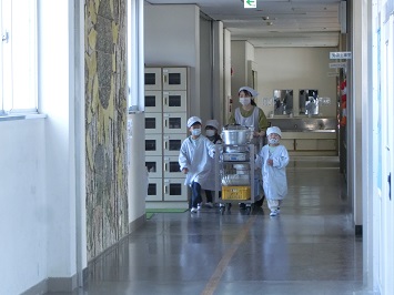 4月16日(水)から1年生の給食がスタートしました。学級担任の他に栄養教諭や図書館司書教諭など,担任をもたない教職員が補助に入りました。