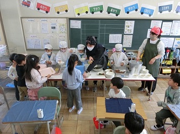 水道で手を洗い,静かに座って待つことができました。また,給食当番の児童は,白衣とマスクを身に付け,配膳にも挑戦しました。