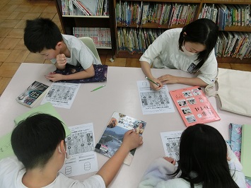 6年生のオリエンテーションでは,「本のラベル当て」をしました。普段児童たちは,本のラベルに書かれている分類番号をよく確認し,その番号が書かれた本棚に本を返却しています。クイズでは,日頃とは逆に本の種類や題名から分類番号を予想しました。