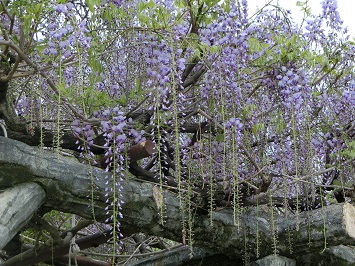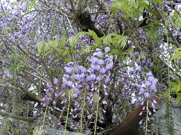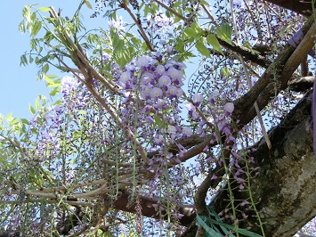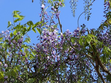 温かい日が続いているため、大藤の花が次々と開花しています。今週は、先週に比べて、房がさらに長く伸び、薄紫色の小さな花がぎっしりと咲いている様子が見られます。