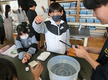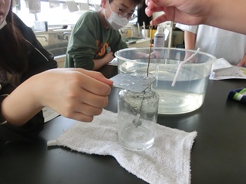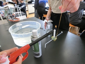 6年生は理科の時間に「ものが燃えるしくみ」について学習しています。この日は,ものを燃やすはたらきのある気体について調べるため,空気中に含まれる,酸素,二酸化炭素,窒素に火をつけるとどうなるか実験しました。