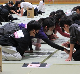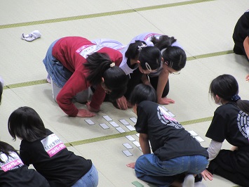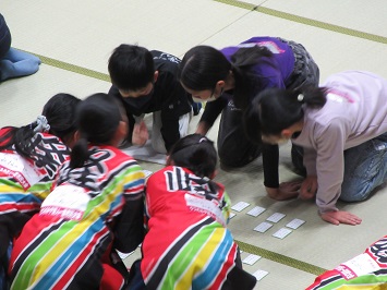 午前中に行われた予選を見事突破し,午後の決勝戦へ進出しました。上の句の一音目ですぐに札を取ったり,仲間同士声を掛け合ったり,これまで学校や自宅で練習してきたことが存分に発揮されていました。