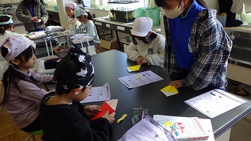図書委員の児童が折り方を教えてくれました。下級生に対しては,折り方を実際に見せながらゆっくりと説明していました。