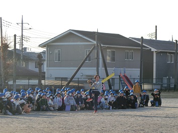 その後「先生紹介」を行い,今回は野球が得意な教諭を紹介しました。スピードの速い球や遠投などを見せました。見ている児童からは歓声が上がっていました。