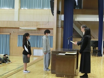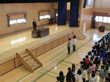全校児童が体育館に集まり,表彰朝会を行いました。今回も6年生の代表児童による挨拶からスタートしました。